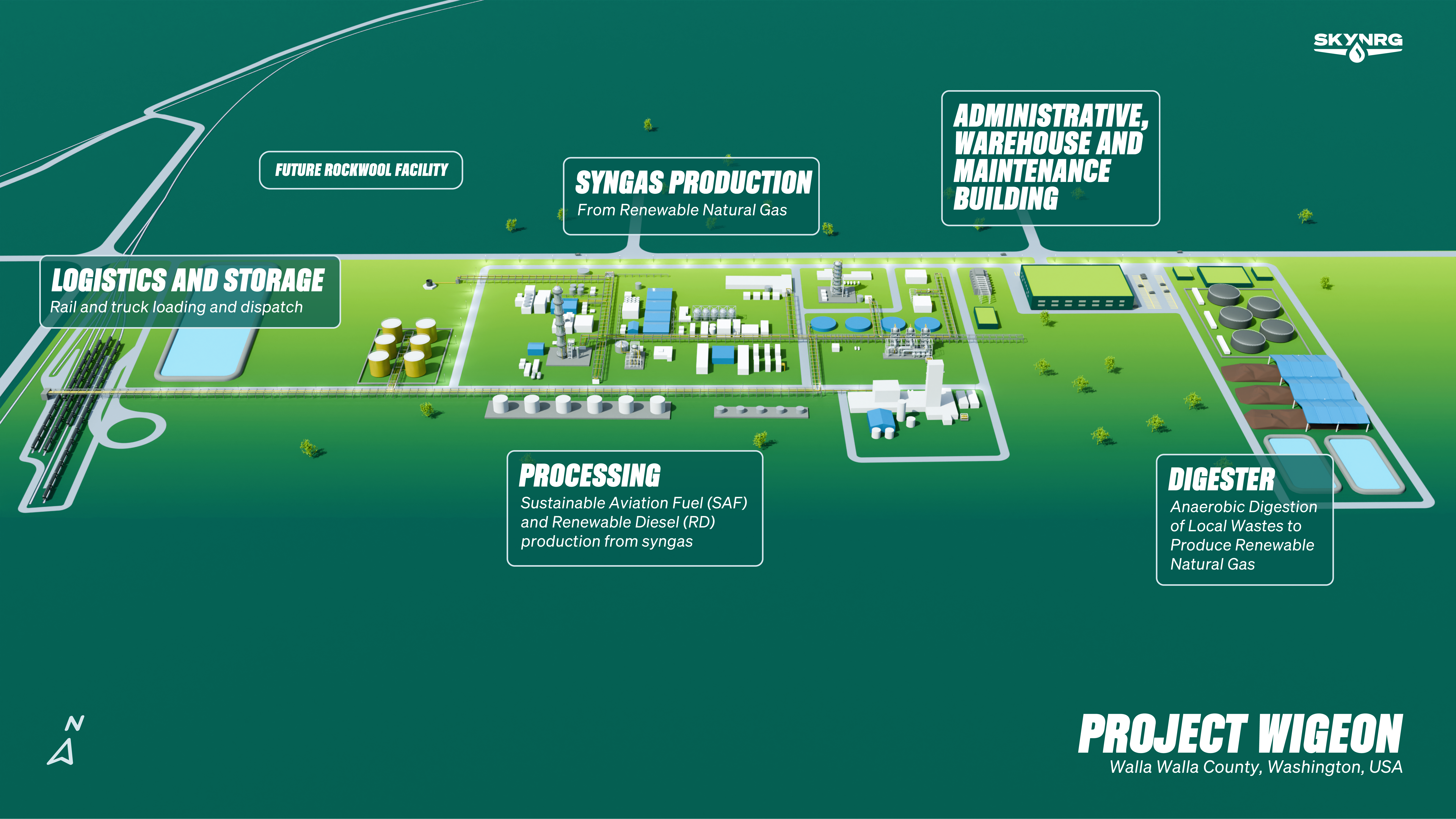 SkyNRG’s Project Wigeon is a commercial scale sustainable aviation fuel (SAF) and renewable diesel production facility under development at the Port of Walla Walla’s Wallula Gap Industrial Park in Washington State, representing the company’s first SAF production plant in North America. The facility is designed to produce approximately 50 million gallons per year (about 150,000 tonnes) of SAF, targeting supply to West Coast aviation markets and regions supported by clean fuel standards and decarbonization mandates. The project focuses on converting renewable natural gas (RNG) or biogenic methane sourced from landfills, wastewater treatment plants, agricultural waste, and other organic streams into drop in jet fuel, positioning it among the first commercial scale RNG to SAF facilities in North America. Environmental approvals have been secured, allowing the project to advance into engineering and development phases, with construction expected to generate significant local employment and startup anticipated toward the end of the decade. Strategic partnerships and industry collaboration, including engagement with aerospace stakeholders such as Boeing, support project commercialization and help anchor long term SAF demand while contributing to the scaling of domestic low carbon aviation fuel supply. Engineering is ongoing, construction of the project is expected to begin in 2027 and we anticipate SAF/RD production beginning in 2030.