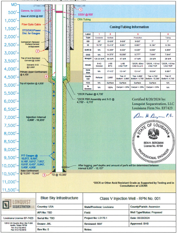 River Parish Sequestration LLC is developing the River Parish Sequestration Project (RPS Project) as a large scale CO2 transportation and geologic storage solution serving the Louisiana Chemical Corridor between Baton Rouge and New Orleans, one of the most concentrated industrial emissions regions in the United States. The project area is adjacent to more than 50 existing industrial facilities that collectively emit approximately 60 million metric tons of CO2 per year. The RPS Project is designed to support three Class VI injection wells with a combined storage capacity of approximately 176 million metric tons of CO2 over a 30 year injection period, creating a long life regional storage hub for hard to abate industrial sources. Project development includes advanced site characterization and permitting activities, such as completion of an aerial magnetic survey to identify legacy wells and other artificial penetrations, and the permitting drilling and injection testing of a stratigraphic test well to confirm reservoir and confining zone performance. In parallel, River Parish Sequestration is completing a front end engineering and design study for the RPS Pipeline System, which will transport captured CO2 from nearby industrial emitters to the sequestration complex. Permitting efforts are now advancing, with the Louisiana Department of Energy and Natural Resources releasing a draft UIC Class VI permit for one of the RPS injection wells, marking a significant regulatory milestone and reflecting the state’s newly assumed Class VI primacy. The project is supported by $25.6 million in US Department of Energy funding, alongside $6.4 million in non federal cost share, for a total project value of approximately $32.0 million, and represents one of the most advanced CCS hub developments currently underway in Louisiana. RPS signed a binding CO2 Offtake and Storage Agreement (COSA) with ExxonMobil Low Carbon Solutions Onshore Storage LLC (ExxonMobil) whereby RPS is obligated to transport and sequester at least 850,000 metric tons and up to 4,000,000 metric tons of Captured CO2 per year supplied by ExxonMobil.