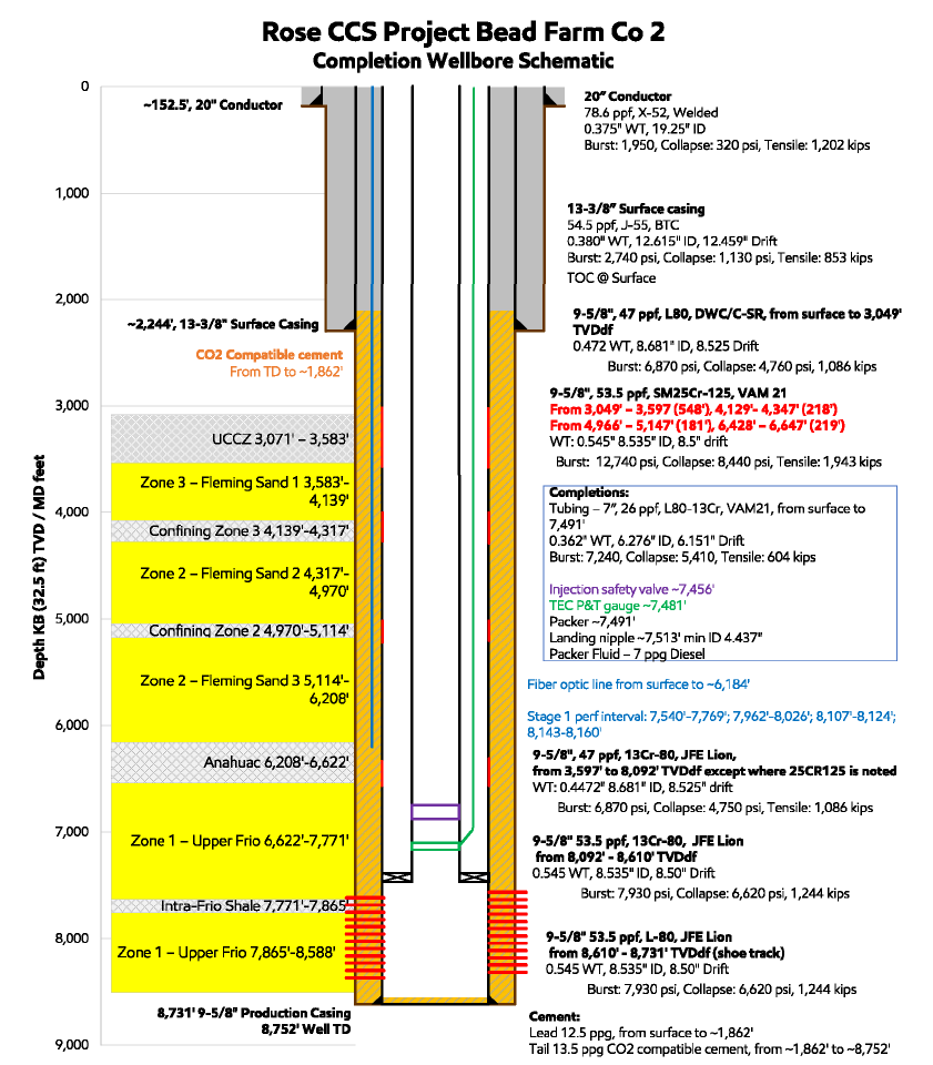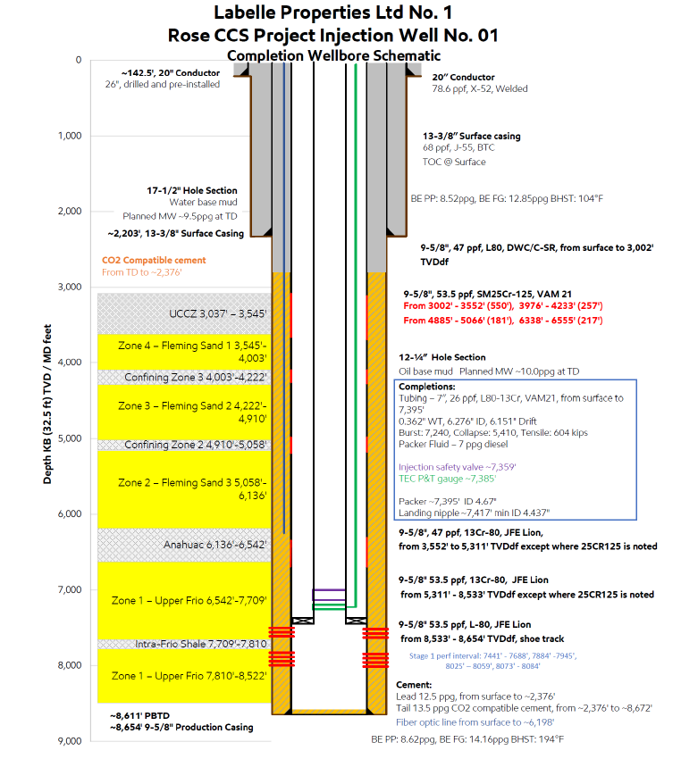 ExxonMobil’s Rose CCS Project in Jefferson County, Southeast Texas, is a large-scale carbon storage initiative designed to capture and permanently store CO₂ from regional industrial sources. The project includes an 18-mile CO₂ transport pipeline connected to a storage site spanning over 13,000 acres of private land. At the site, three dedicated Class VI injection wells will place CO₂ deep underground—between half a mile and 1.5 miles below the surface—into secure geologic formations. Environmental safety will be ensured through extensive monitoring, including three water monitoring wells and one in-zone CO₂ monitoring well. Under draft permits, ExxonMobil is authorized to inject between 1.1 and 1.67 million metric tons of CO₂ per well per year, with a total project cap of 5 million metric tons annually across all three wells. Over the planned 13-year injection period, this amounts to a maximum storage potential of 53 million metric tons of CO₂.