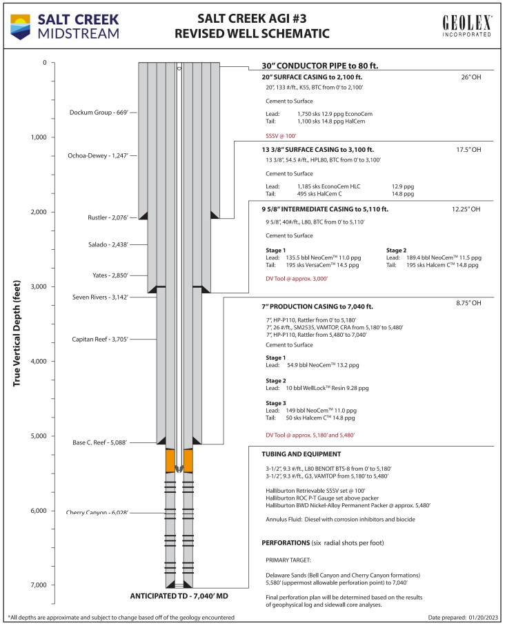 The Titan carbon storage project is an acid gas injection operation associated with the Titan Treating Facility operated by Northwind Midstream in Lea County, New Mexico within the Delaware Basin of the Permian Basin. The facility processes sour natural gas streams containing elevated concentrations of carbon dioxide and hydrogen sulfide, with separated treated acid gas compressed and injected into deep subsurface formations through Class II injection wells. The Salt Creek AGI No. 3 well was drilled and completed as a vertical injection well in October 2023 targeting the Delaware Mountain Group (DMG) formation. This well replaced the originally permitted Salt Creek AGI No. 1 well, which encountered drilling issues and was subsequently plugged and abandoned. Salt Creek AGI No. 2 is a directional injection well targeting the deeper Siluro-Devonian formation; drilling commenced in August 2024 with injection expected by the end of 2024. The well is drilled approximately 1,400 feet southeast from its surface location to access more favorable reservoir conditions identified through 3D seismic evaluation. Salt Creek AGI No. 2 is permitted to inject up to 12 MMscf/d of treated acid gas with a maximum allowable surface injection pressure of 5,798 psi, while Salt Creek AGI No. 3 is permitted for 8 MMscf/d with a maximum allowable surface injection pressure of 2,149 psi. The injected stream consists primarily of CO₂ with hydrogen sulfide, and storage occurs as part of ongoing sour gas processing operations rather than as a dedicated saline carbon storage development.