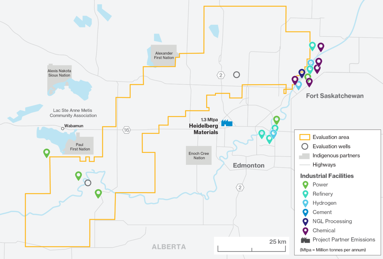 The Wabamun Carbon Hub, developed by Enbridge west and north of Edmonton, Alberta, is intended to provide industrial-scale CO₂ transportation and storage as an open-access utility. It supports nearby major emitters, notably Heidelberg Materials’ cement capture facility and Capital Power’s Genesee CCS project—together aiming to avoid up to 4 million tonnes of CO₂ emissions annually. Enbridge secured evaluation rights in 2022 over approximately 220,000 hectares covering two deep saline formations—the Basal Sandstone Unit (2,300–3,300 m) and the Nisku Formation (1,550–2,200 m)—and has since drilled two test wells (spring 2023 and late 2023/early 2024) to assess geological suitability