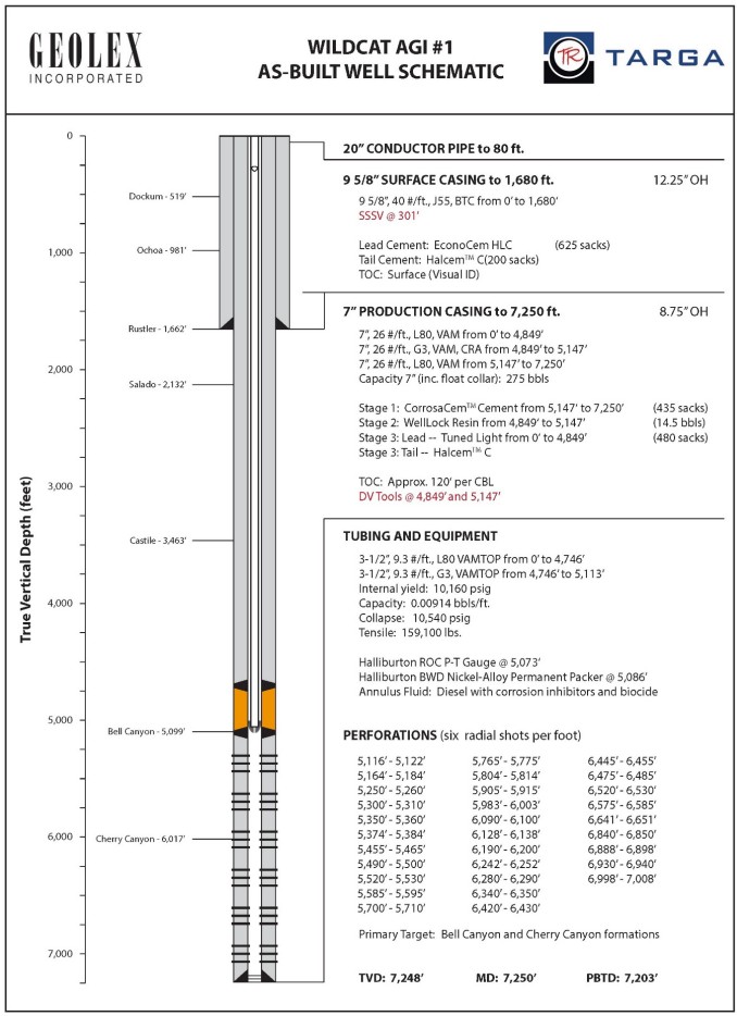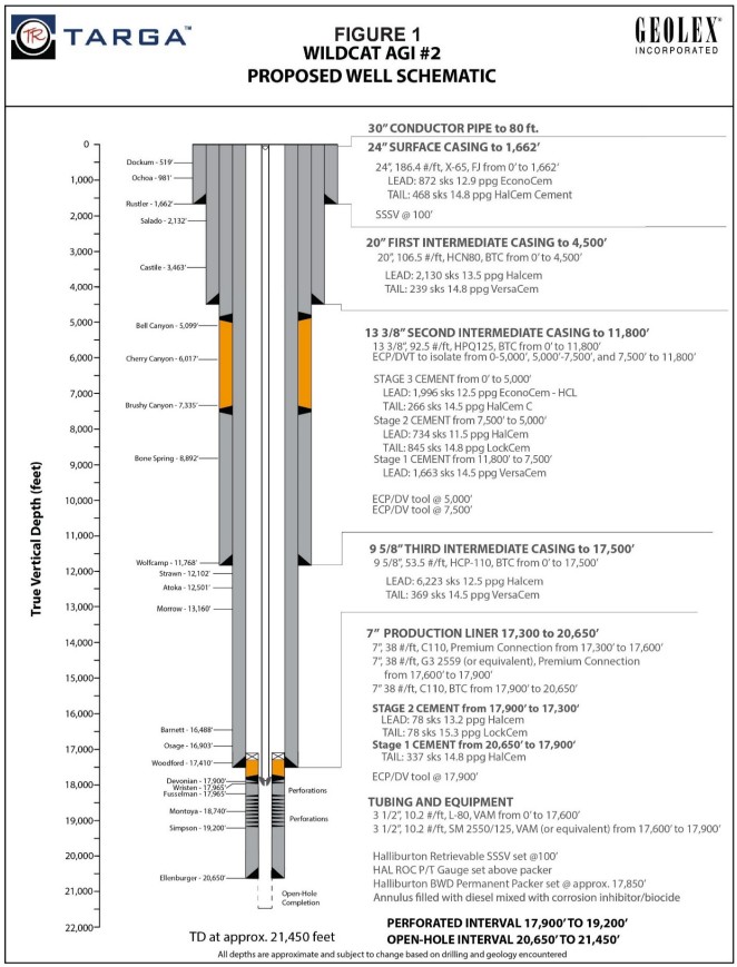 The Wildcat Gas Plant carbon storage project is an acid gas injection (AGI) sequestration operation operated by Targa Delaware LLC associated with the Wildcat gas processing facility. The project permanently injects treated acid gas (TAG) generated during natural gas processing into deep geologic formations for long-term storage. Targa is currently authorized to inject up to 28 million standard cubic feet per day (MMSCFD) of TAG through the approved WC AGI #1 well. Targa also received approval in 2023 to drill, complete, and operate WC AGI #2, which is permitted to inject up to 15 MMSCFD of TAG at an approximate total depth of 21,450 feet within the Lower Devonian Thirtyone through Ordovician Ellenburger formations. Targa intends to continue injecting CO₂ through WC AGI #1 for approximately 30 years. The MRV plan submitted under EPA Subpart RR establishes monitoring, reporting, and verification protocols to quantify injected CO₂ volumes and demonstrate permanent geologic containment.